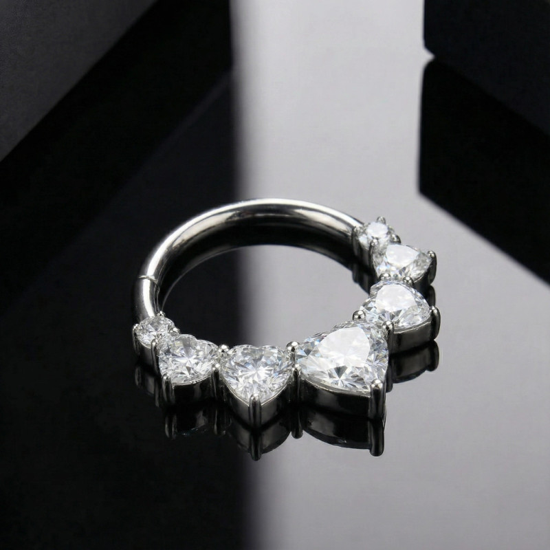 Scharnier Ring aus Implantat-Titan mit 5 Herz-Zirkoniasteinen und 2 runden Zirkoniasteinen