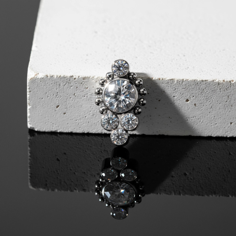 Implant Grade Titanium Internally Threaded 5 CZ Cluster and Beaded Ball Center Edge Top