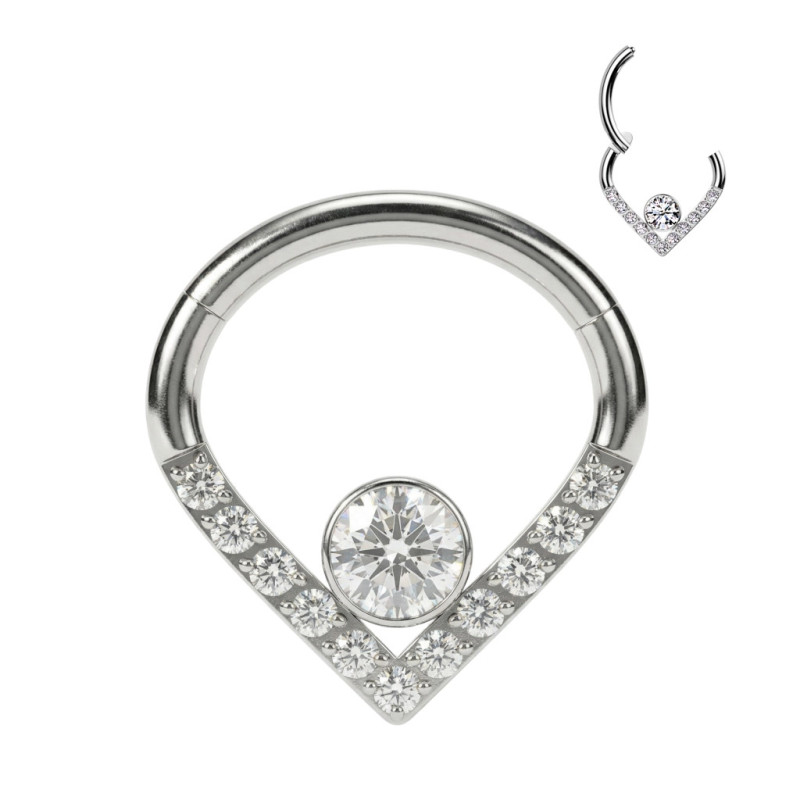Implant Grade Titanium Hinged Segment Hoop Ring With Pave CZ Single Line Chevron and CZ Center