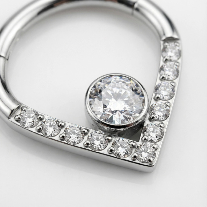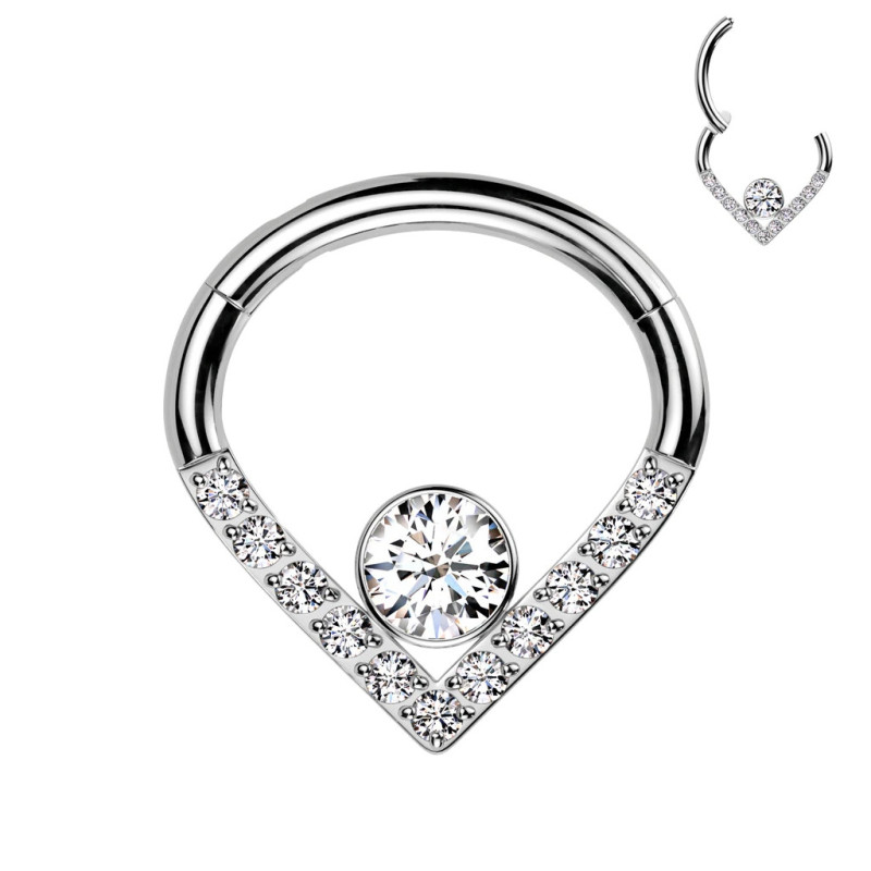Aro en Forma de Chevron con Bisagra de Titanio Grado Implante y Circonitas en Pavé y Bisel Central