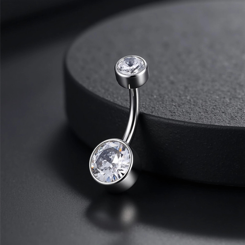 Joya para Ombligo de Titanio con Doble Circonita Redonda en Bisel y Rosca Interna