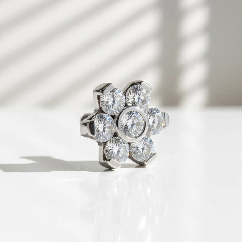 Top Flor de Zircónia com Centro em Bisel e Pétalas em Garras de Titânio Grau Implante com Rosca Interna