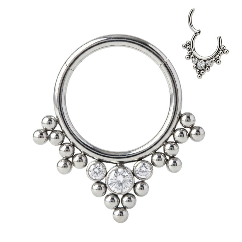 Argola com 3 Zircônias em Bisel e Esferas Tribais em Cacho e Dobradiça de Titânio Grau Implante